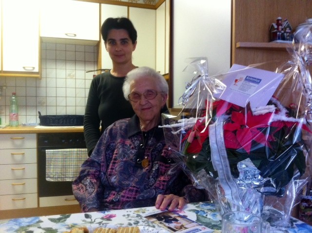 Unsere Gebietsleiterin für Niederösterreich, Frau DGKS Gerlinde Weiß, und die rumänische Personenbetreuerin, Frau Cornelia-Laura Olteanu, überreichen Frau Angela S. einen Blumenstrauß anlässlich ihres 90. Geburtstages.